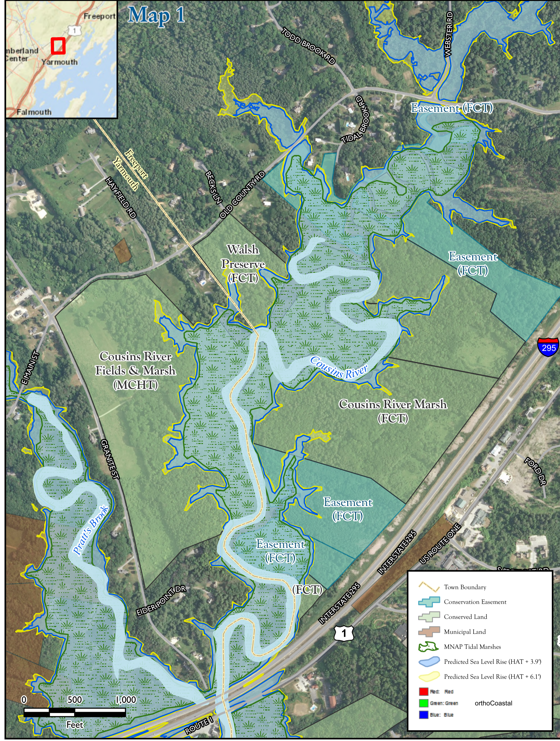 Formed in 2023, the Cousins River Marsh Collaborative brings together land trusts, local towns, state and federal partners, and community members dedicated to conserving the Cousins River watershed. The Cousins River Marsh Collaborative is made up of Maine Coast Heritage Trust, Royal River Conservation Trust, Freeport Conservation Trust, U.S. Fish and Wildlife Service Gulf of Maine Coastal Program, Northeast Climate Adaptation Science Center, and the Casco Bay Estuary Partnership.